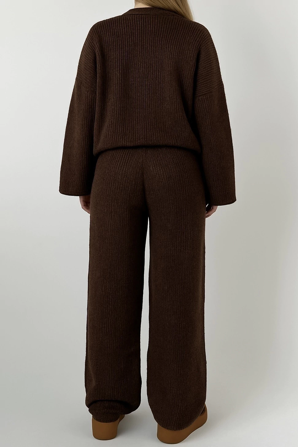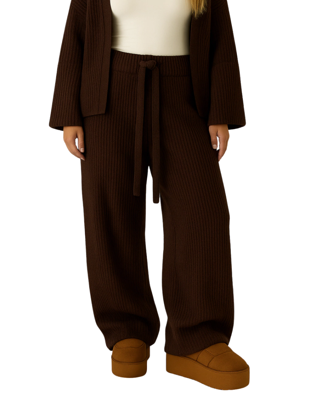 Calça de tricot feita com fio mousse - uma trama fechada e quentinha, perfeita para o outono/inverno. Possui elástico na cintura e se adapta facilmente ao corpo. Na foto, modelo está usando a calça com o cardigan cropped coffee brown.
