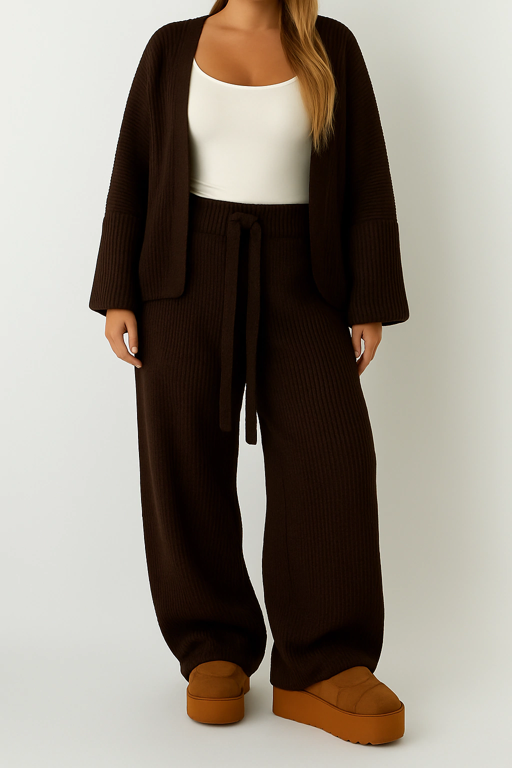 O cardigan cropped tem comprimento na altura do bumbum e é feito com fio mousse - uma trama fechada e quentinha, perfeita para o outono/inverno. Na foto, modelo combina com nossa calça de tricot no mesmo tecido.